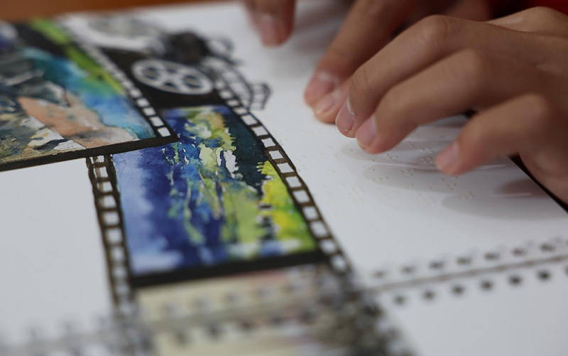 盲童摸读《美丽中国》盲文内容。