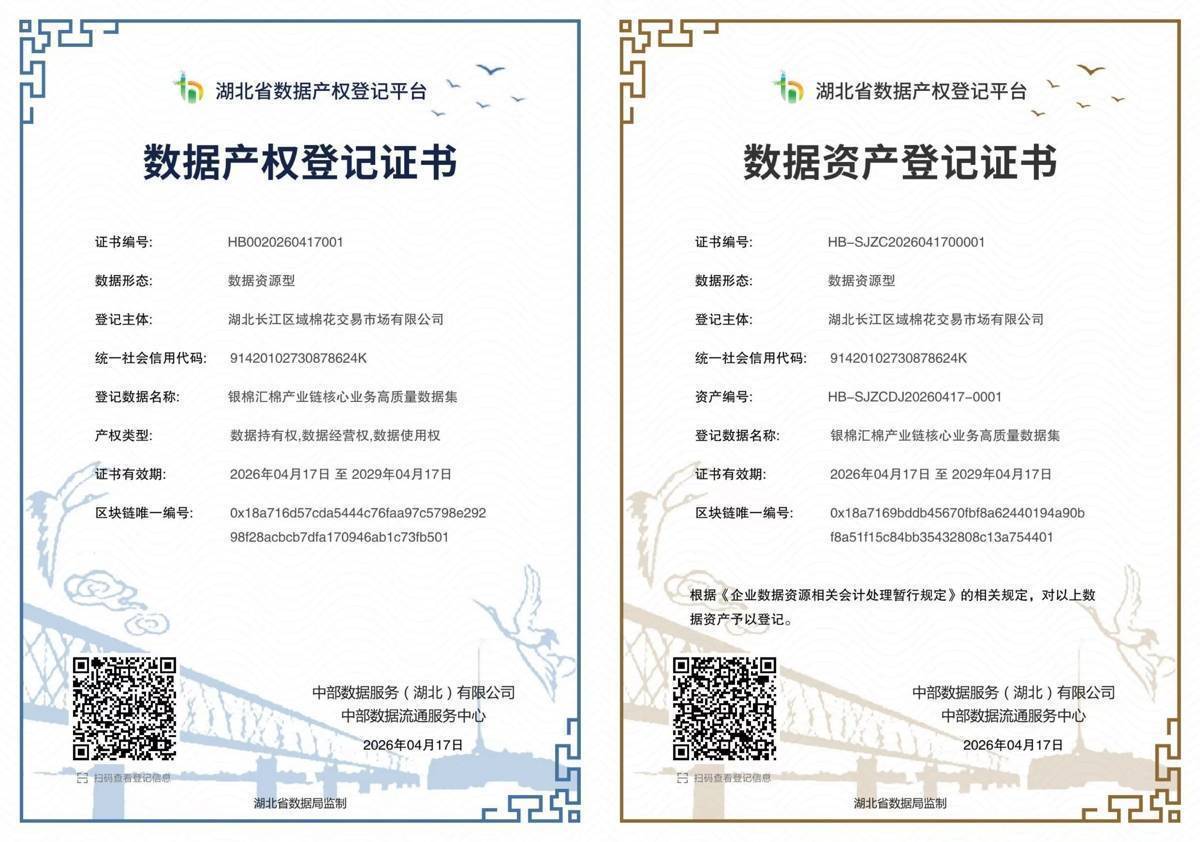 湖北日报讯(记者陈莉霖、通讯员刘秉昊)4月23日,在2026长江棉花产业高质量发展暨风险管理交流会上获悉,由湖北长江区域棉花交易市场有限公司申报的“银棉汇棉产业链核心业务高质量数据集”通过数据产权登记,在中部数据流通服务中心领取《数据产权登记证书》《数据资产登记证书》,成为全国供销系统首例棉产业数据资产入表项目。