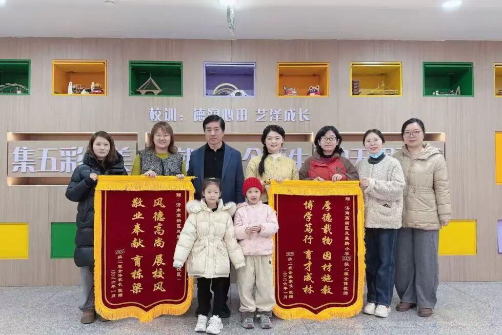 鲁网2月5日讯近日,济南高新区凤凰路小学(西校区)迎来了一份暖意融融的认可。张暖晨妈妈,侯杨妈妈和楚圣熙妈妈代表一年级2班全体家长向学校及班级教师赠送锦旗,以“敬业奉献育栋梁,师德高尚展校风”赞誉学校育人风范,以“博学笃行 育才成林,厚德载物 因材施教”致敬教师辛勤付出。张宜峰校长和李妍校长代表学校接收了锦旗,并对家长表示了诚挚的感谢。锦旗虽轻,情意厚重,既是对教师工作的由衷肯定,更是对学校教育理念的真挚呼应。