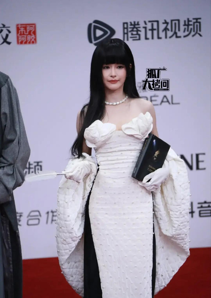 当然,也有相对稳妥的。马秋元和王格格就聪明得多。红毯上有个不成文的规矩:不知道穿什么,选公主裙准没错。马秋元的妆造得体,气质温婉,一看就是有“美商”的。王格格更是懂得利用优势,一袭长裙凸显出修长的脖颈,手里的玫瑰也与服装呼应,整体完成度很高。这或许就是她们能从短剧赛道脱颖而出,开始接触长剧的原因——她们更懂如何将自己“商品化”。