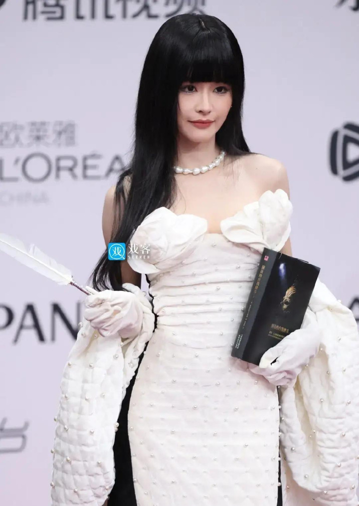 余茵,前几天在别的红毯上还状态在线,这次却老气横秋。厚重的齐刘海配上全包眼线,本想走复古风,却透着一股廉价的年代感,深刻的法令纹更是藏不住。那套裙子也一言难尽,廓形臃肿,被网友戏称“穿着羽绒服就上来了”。